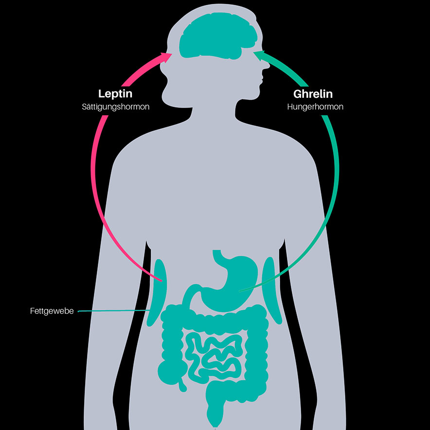 So steuern also Ghrelin und Leptin die Nahrungsaufnahme und sind daher ein wichtiger Regulationsmechanismus des Hungergefühls.